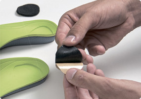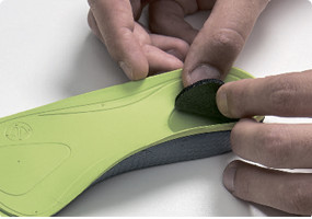 Каждый коррекционный элемент уже имеет заранее нанесенный клеевой слой, и специально отведенное для него место для крепления на заготовке, что исключает ошибку и экономит время при креплении элемента к стельке.